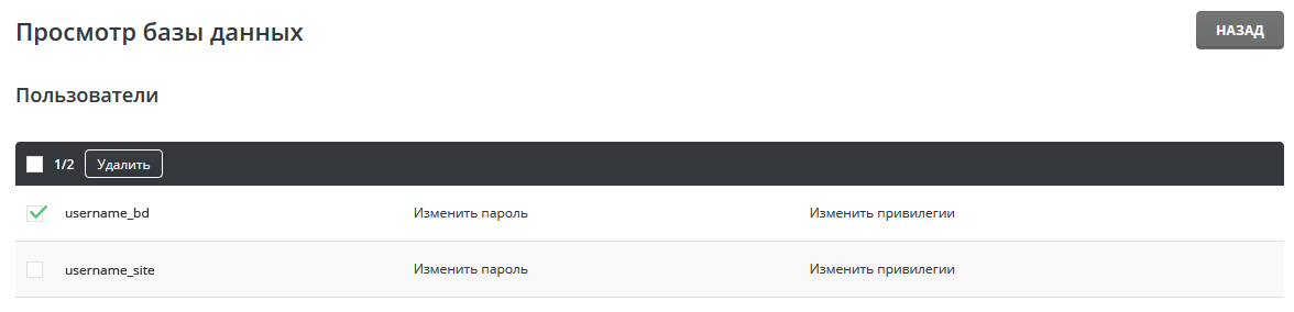 В разделе «Ваш аккаунт» — «Управление MySQL» кликните по названию базы данных, пользователя которой вы хотите удалить. В открывшемся окне поставьте галочки рядом с именами пользователей, которых хотите удалить и в появившемся сверху меню нажмите на кнопку «Удалить».