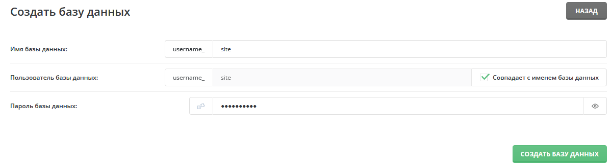 Введите имя базы данных, которое поможет вам запомнить для чего она предназначена. Например, сокращение от название вашего сайта. В название базы данных всегда добавляется имя пользователя панели управления и подчеркивание. К примеру, если вы выбрали название для базы данных site, то итоговое имя базы данных будет следующим — username_site.