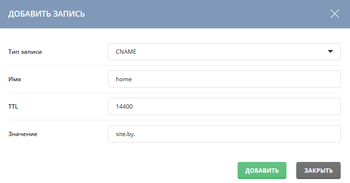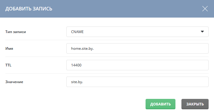Примечание: Если нужный вам IP-адрес имеет формат IPv6, то необходимо добавить AAAA запись такого же вида.