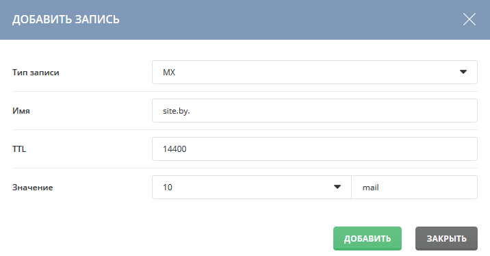 Для добавления «MX» записи введите имя хоста, которое требует выбранный вами почтовый сервис (не забудьте поставить точку в конце имени хоста). Затем выберите уровень приоритета (обычно 10) из выпадающего меню и значение, которое так же предоставляет почтовый сервис. Нажмите кнопку «Добавить».