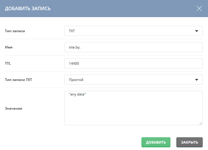 «TXT» запись первоначально используется как способ хранения новых типов информации. Эта информация может быть любым текстом. Запись будет выглядеть так: