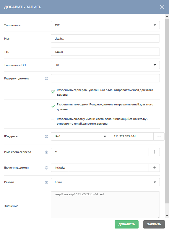 Примечание: «TXT» запись часто используется для настройки «SPF» записей, которые используются для проверки сервера отправителя почтовых сообщений.