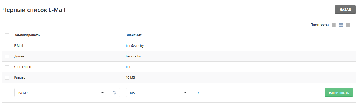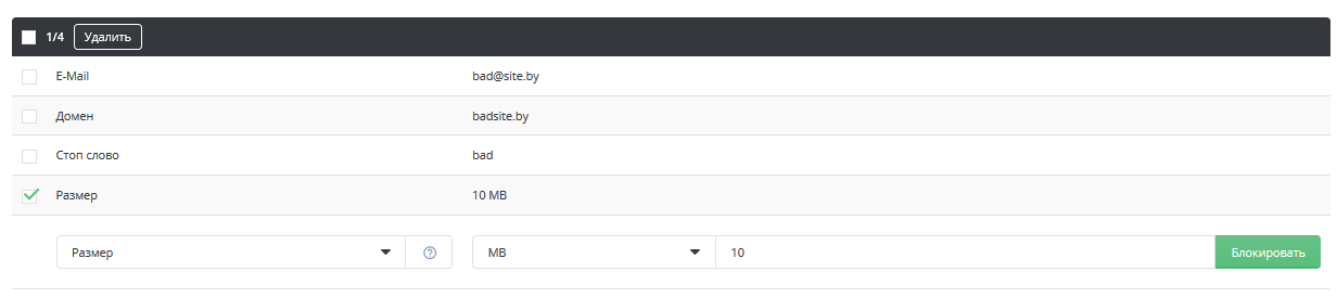 Настраиваемые фильтры в разделе «Черный список E-Mail» позволяют блокировать определенные типы входящей почты. Фильтры универсальны, то есть нельзя задать фильтр для определенных учетных записей электронной почты. Для настройки фильтров перейдите в раздел «Управление E-Mail» — «Черный список E-Mail».