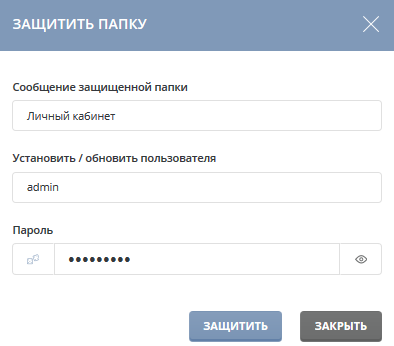 Заполните поля «Сообщение защищенной папки» (к примеру, Личный кабинет); «Установить/обновить пользователя» — имя пользователя; «Пароль» для папки и нажмите на кнопку «Защитить».