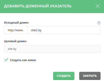 Установите галочку в графе «Создать как Алиас», чтобы посетители сайта в строке браузера видели доменное имя site.by вместо site2.by.