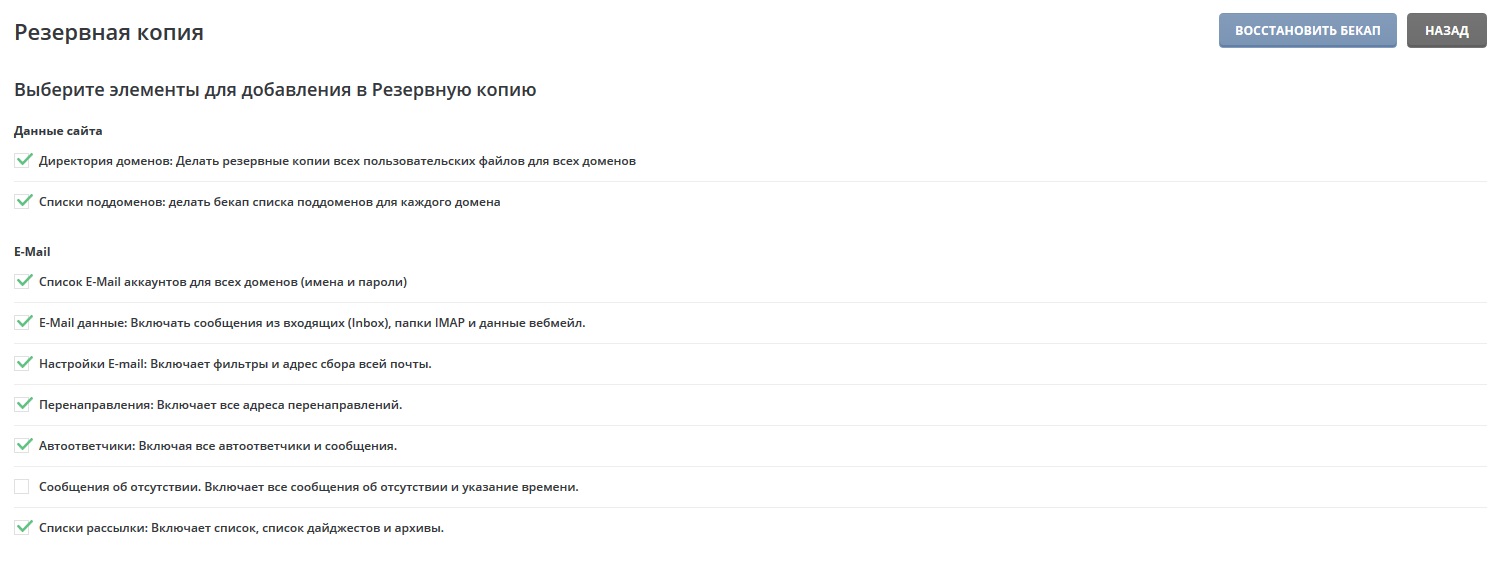 На этом этапе вы можете выбрать, какие элементы вам необходимо восстановить из бэкапа. Например, на картинке ниже, мы выбрали для восстановления все данные сайта и элементы электронной почты, за исключением сообщений об отсутствии. После того, как вы закончите, нажмите кнопку «Восстановить».