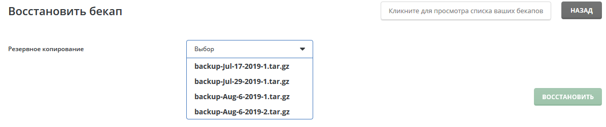 После того, как вы загрузили нужные файлы, вернитесь в раздел «Доп. возможности» — «Резервные копии» и нажмите кнопку «Восстановить бэкап». В графе «Резервное копирование», в выпадающем меню, вы увидите все бэкапы расположенные в папке /backups. Выберите файл, который вы хотите восстановить.