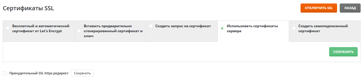 Для его установки перейдите в раздел «Мой аккаунт» - «Сертификаты SSL», выберите пункт «использовать сертификаты сервера» и нажмите кнопку «Сохранить» в нижней части экрана.
