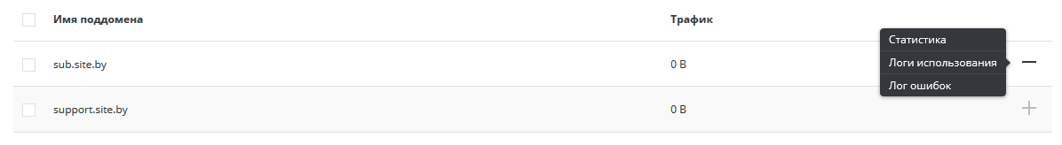 Напротив нужного поддомена нажать на кнопку «+» и в выпадающем меню выбрать пункт «Статистика».